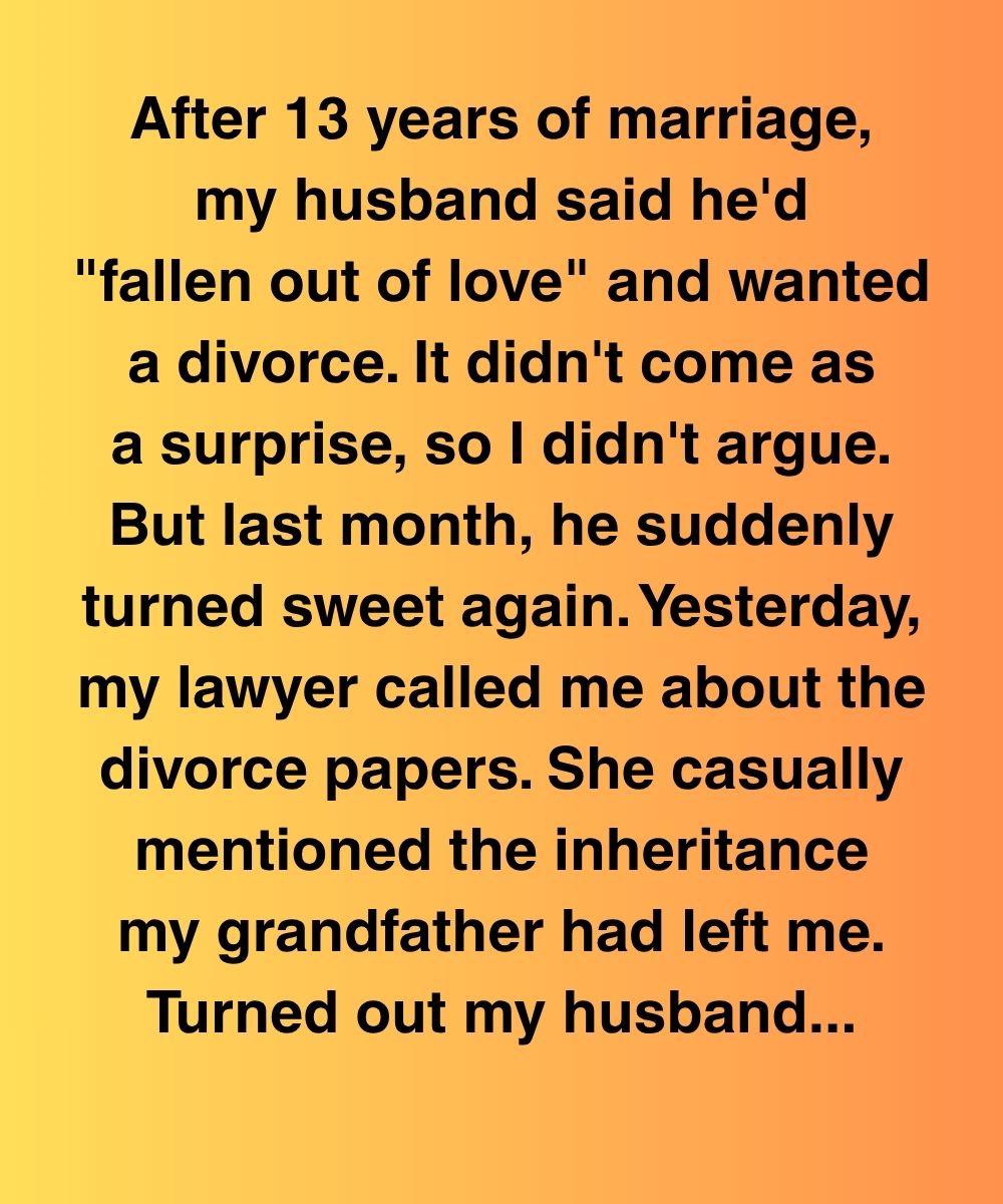 After 13 years of marriage, my husband said he’d “fallen out of love” and wanted a divorce. It didn’t come as a surprise, so I didn’t argue. But last month, he suddenly turned sweet again. Yesterday, my lawyer called me about the divorce papers. She casually mentioned the inheritance my grandfather had left me. Turned out my husband had added a clause requesting a share of it—even though it was left solely to me.